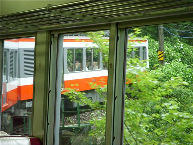 接著再搭車去強羅(Gora)吃午餐,這種登山小火車很可愛, 她開ㄧ開還會"倒退"開去下ㄧ站