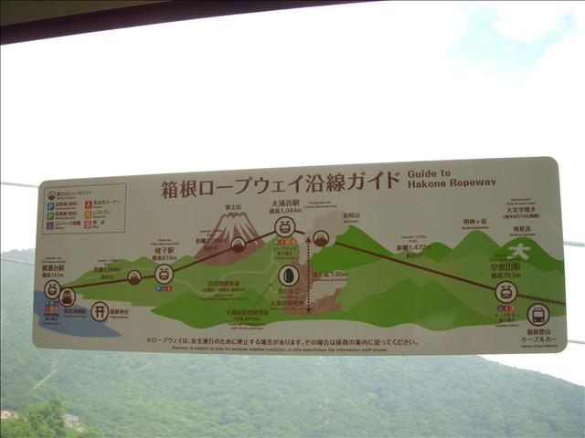 再繼續搭纜車往下去桃源台(Togendai), 車廂內的"箱根ropeway沿線guide"清楚指示纜車行徑路線, 高度