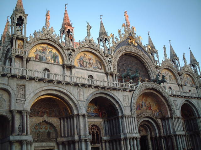 聖馬可教堂, 不僅是威尼斯的宗教紀念性建築, 也是威尼斯的政治權利象徵.聖馬可教堂是新上任總督宣誓就職的地方,也是總督歡送指揮戰艦和部隊將領奔赴戦場必為他們祈禱的地方. 聖馬可教堂的正外力面有五個拱門, 還有五個東方藝術的圓屋頂, 每個門洞上刻有[收回福音佈道者屍體]故事中的一個場面. 門廊上面還裝飾著雖尼斯羅馬派風格的浮雕作品,描繪著職業, 月份和美德
