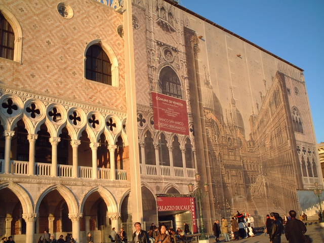 這是即將修繕好的總督宮(Palazzo Ducale) , 是總督和政府辦公處. 這座建築與其說他是一座宮殿不如說他是一座城堡,它配備了瞭望塔和防禦工事. 外觀上, 建築物下部比較鏤空, 而上部比較實.上層柱廊連續的哥德式拱頂上都裝飾著四辦花型圓窗, 兩層柱廊就是二樓. 二樓大廳以碩大尖拱型大窗採光, 建築物上邊言是以很窄的窄條檐口, 檐口上方相間飾以透雕飾和尖柱