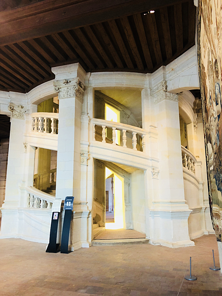 兩條階梯圍繞中間一顆空心的圓柱,從直徑與圓周相交的兩個位置點開始,螺旋上升。如果兩個人同時從兩個樓梯上樓,雙方會多次看到對方,但卻永遠不會在階梯上相遇。人們在達文西的手稿中發現了如出一轍的設計,並由此推斷雙螺旋階梯是他的設計作品。有人認為,這個設計是為了防止國王的情婦們在樓梯上撞見而造成尷尬和爭執。甚至最初的設計可能是一個四螺旋階梯,把每層分隔成各自獨立的四個套房。也就是說,每個套房只能通過自己的那條階梯到達。那住在不同套房裡的情婦們就很難碰見,國王也就可以少花些精力來處理她們間的矛盾了。另一種觀點認為,這是一種源於軍事用途的設計:為保證一座防禦塔中的士兵不至於被敵軍收買而全部叛變,讓他們從彼此不通的路徑進入防禦位置。這樣就在戰時防止整個塔樓失去防禦功能。